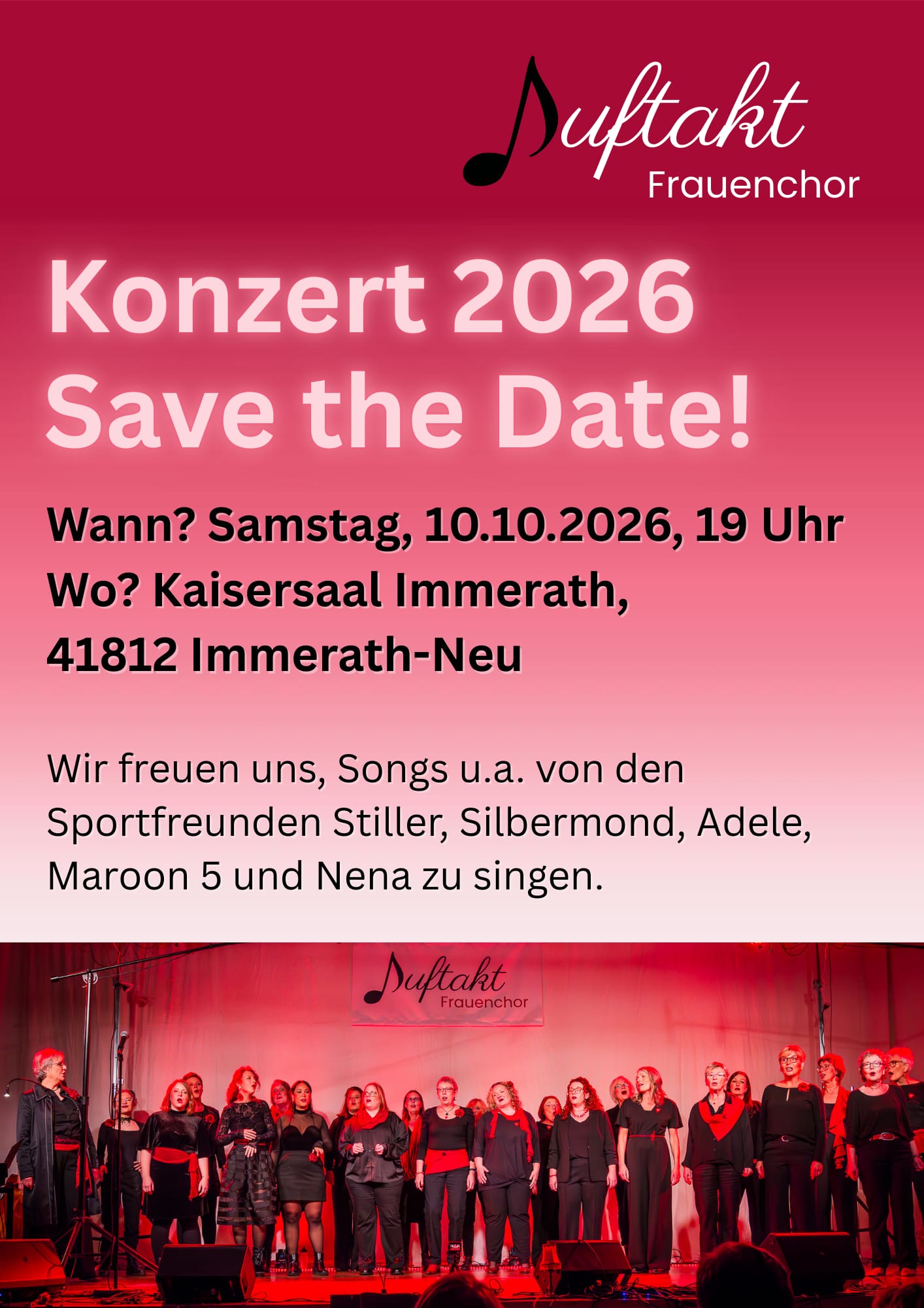 AUFTAKT e.V. ist ein Frauenchor aus Erkelenz unter der Leitung von Anette Latour. Im Jahr 2003 von vier dynamischen jungen Frauen als „Wohnzimmerchor“ aus Spaß am Singen gegründet, wuchsen wir in wechselnder Besetzung im Lauf der Jahre zu einem kraftvollen Chor heran. Aktuell sind wir 28 Frauen im Alter zwischen 22 und 71 Jahren.